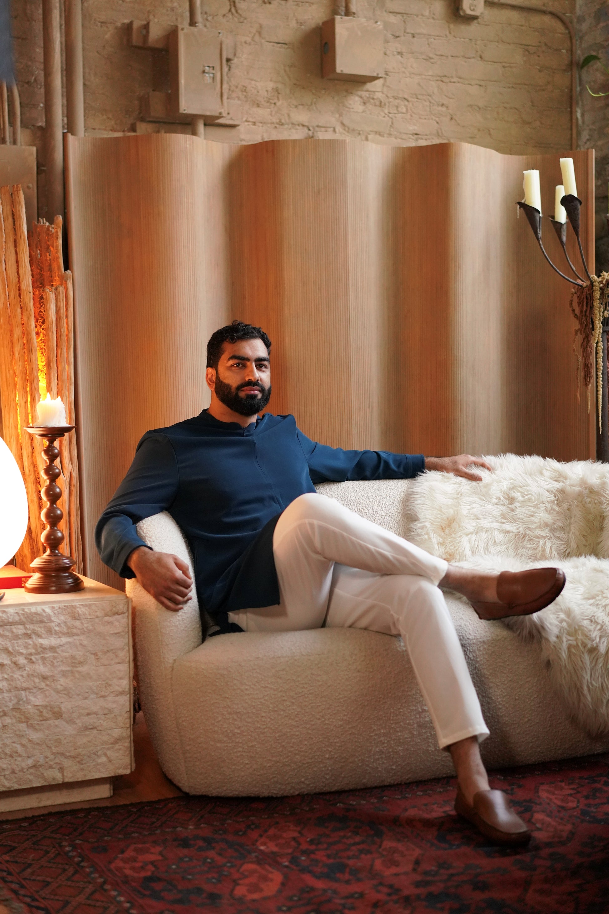 The Peacock Blue Kurta is made from a soft and luxurious heavyweight fabric that feels robust without being rigid. The deep teal color reinforces the garment’s clean lines and tailored form. Our first ever clean zip closure replaces the traditional placket, giving the piece a modern, intentional finish.